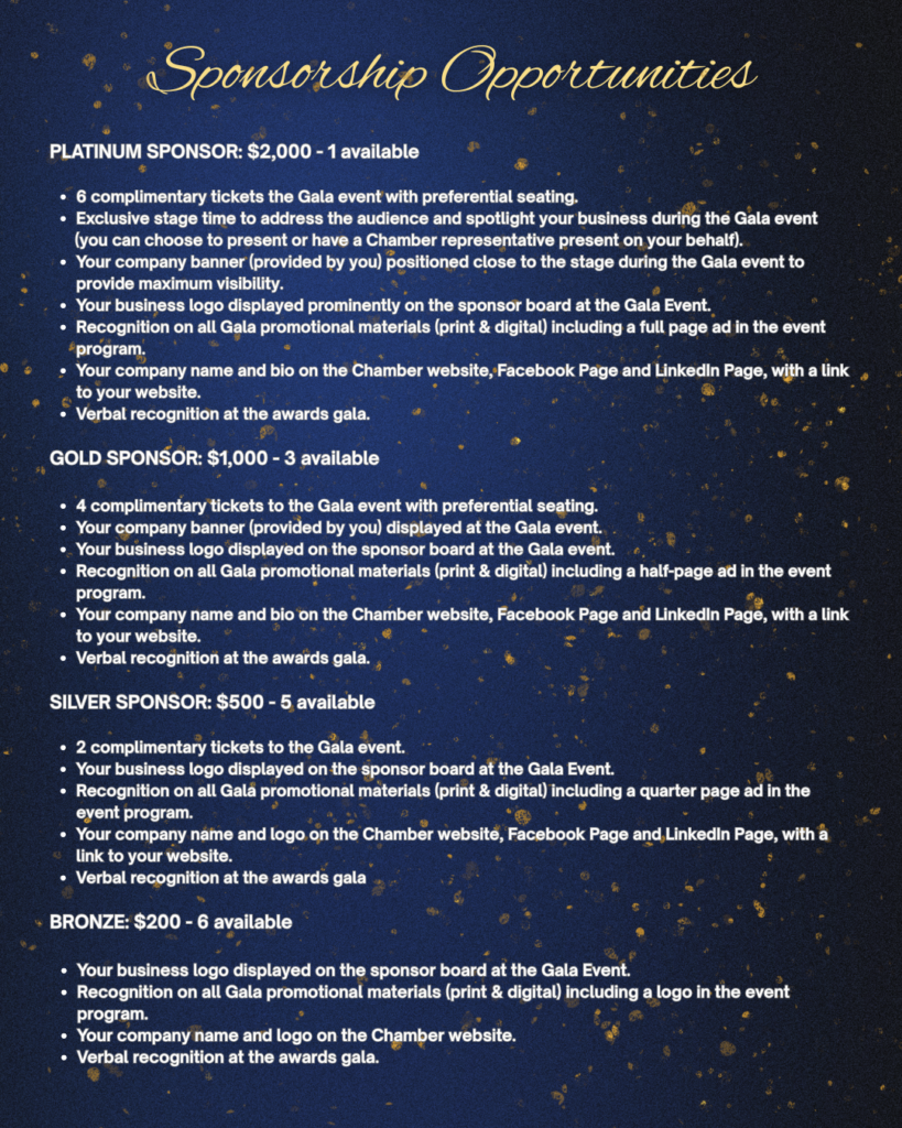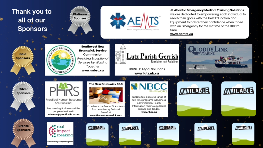 Sponsorship is a great way to support the Chamber and promote you business. Below are details of the sponsorship packages available for this year’s Gala. In addition to sponsorship, the Chamber will also be collecting donations for our Silent Auction. Donations to the Silent Auction must have a minimum value of $50 and be ready for collection by April 30th at the latest. To secure sponsorship or donate to the silent auction, please email info@standrewschamber.ca