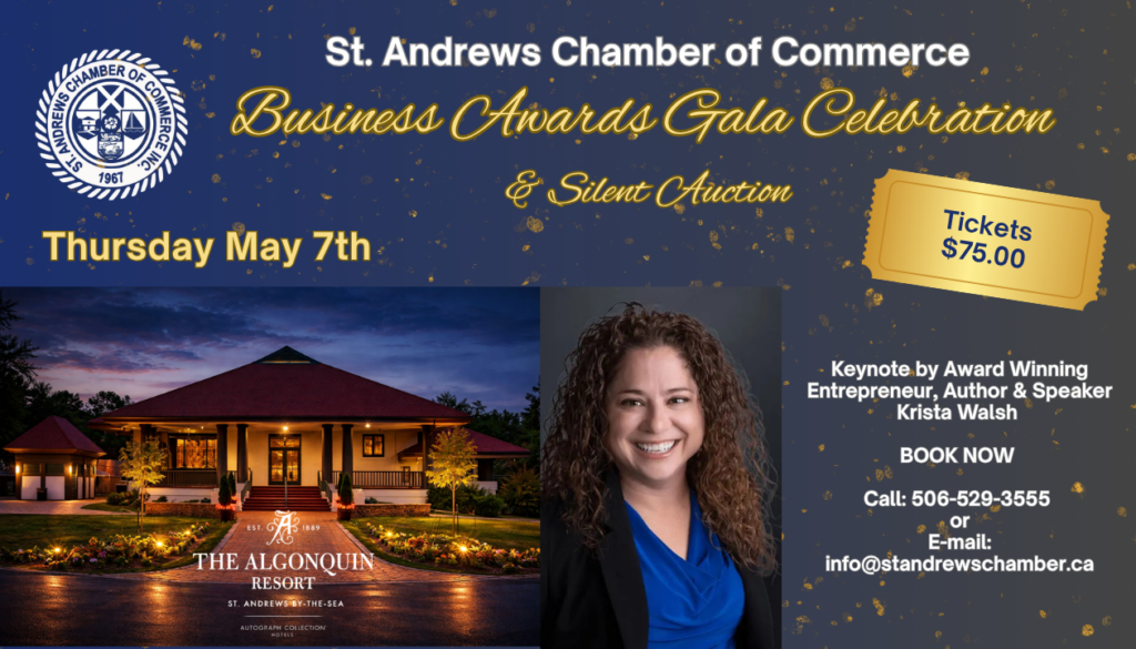 Tickets to the Gala are $75 per person and can only be purchased in advance by emailing info@standrewschamber.ca or calling 506-529-3555